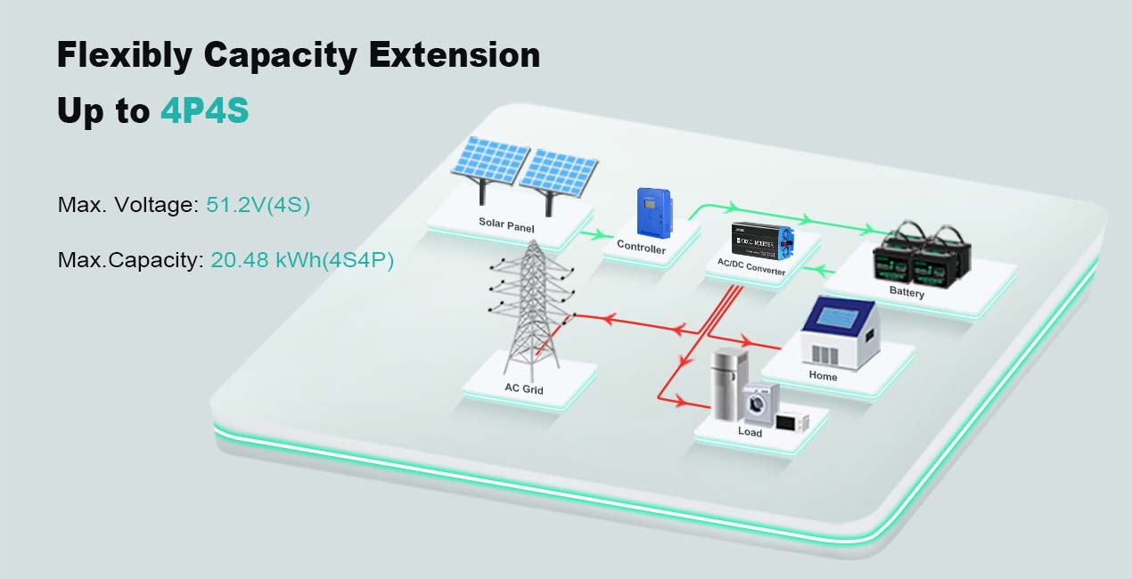 -- Tegangan seri maksimum hingga 51,2V. Artinya, baterai 12,8V dapat dihubungkan menjadi 4 rangkaian, dan baterai 25,6V dapat dihubungkan menjadi 2 rangkaian. Jumlah maksimum koneksi paralel tidak boleh melebihi 4.