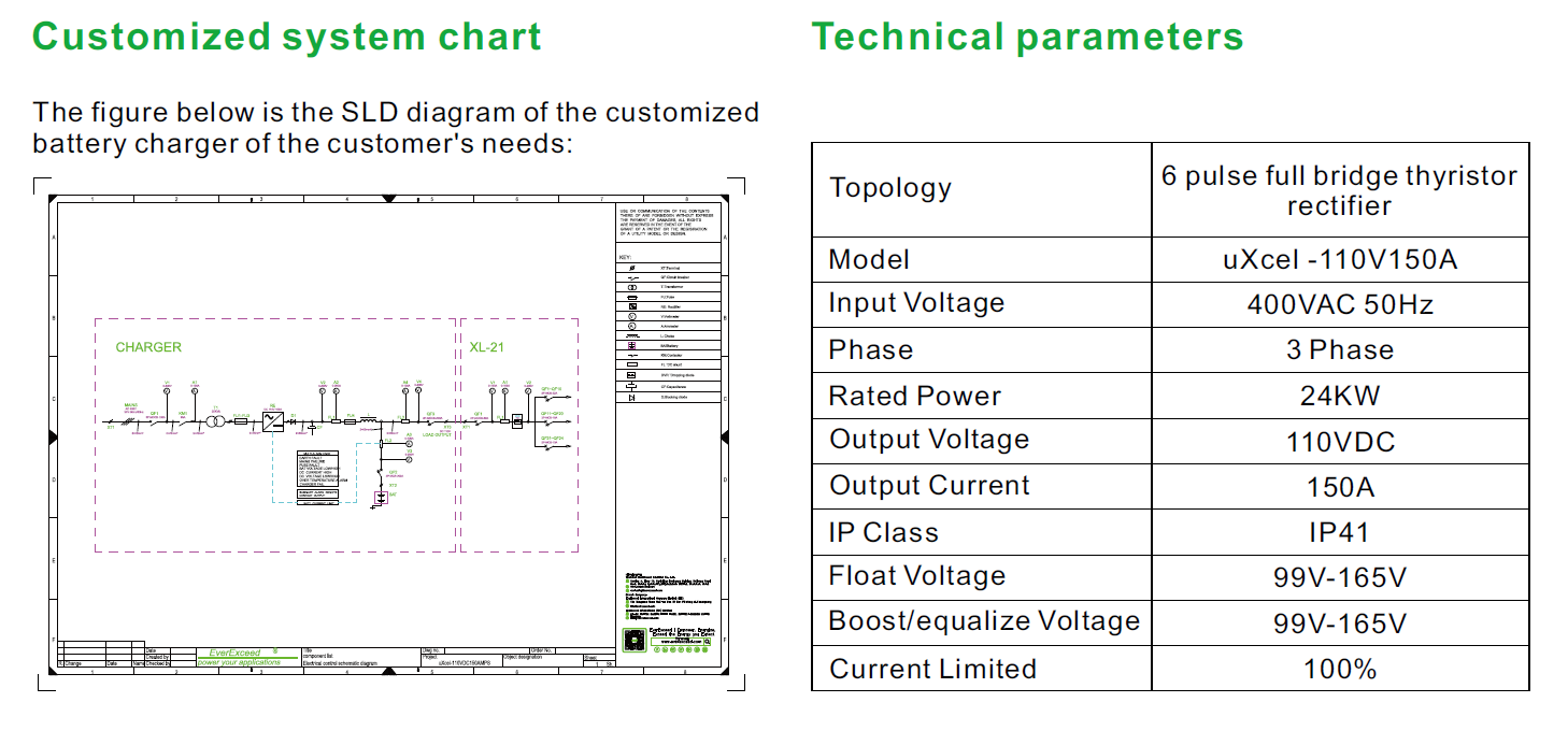 This 110V 150A industrial battery charger is custom-designed for a substation project in Jordan. This charger provides stable DC power for critical applications, including high-voltage switchgear operation and substation control and monitoring systems under both normal and emergency conditions.