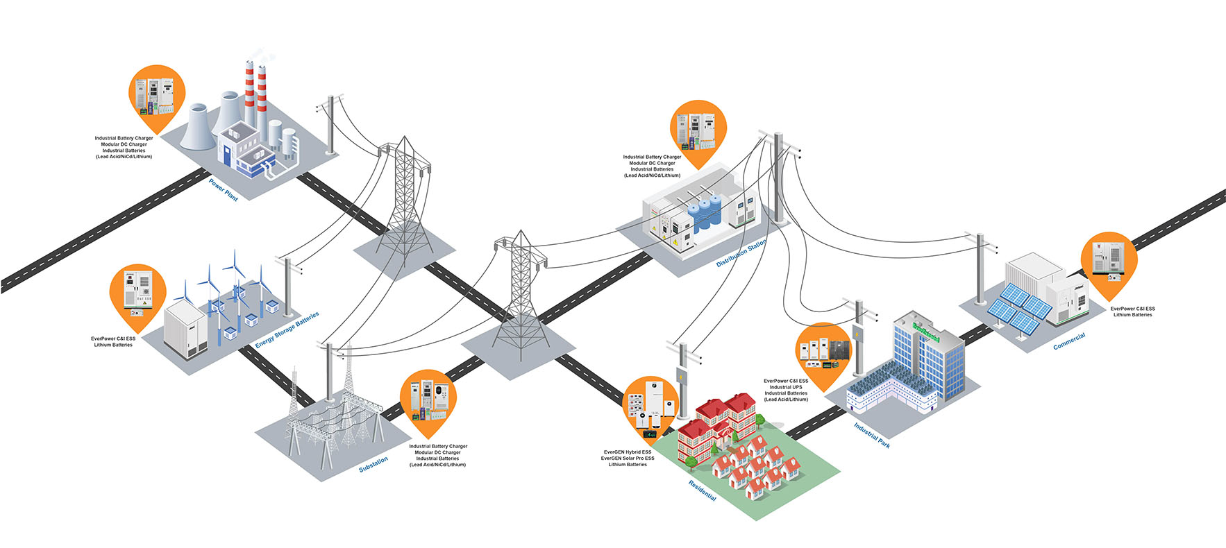 EverExceed menyediakan sistem DC yang dapat diskalakan, pengisi daya industri, dan penyimpanan energi untuk mendukung gardu induk, stasiun switching, dan node transmisi tegangan tinggi/menengah.