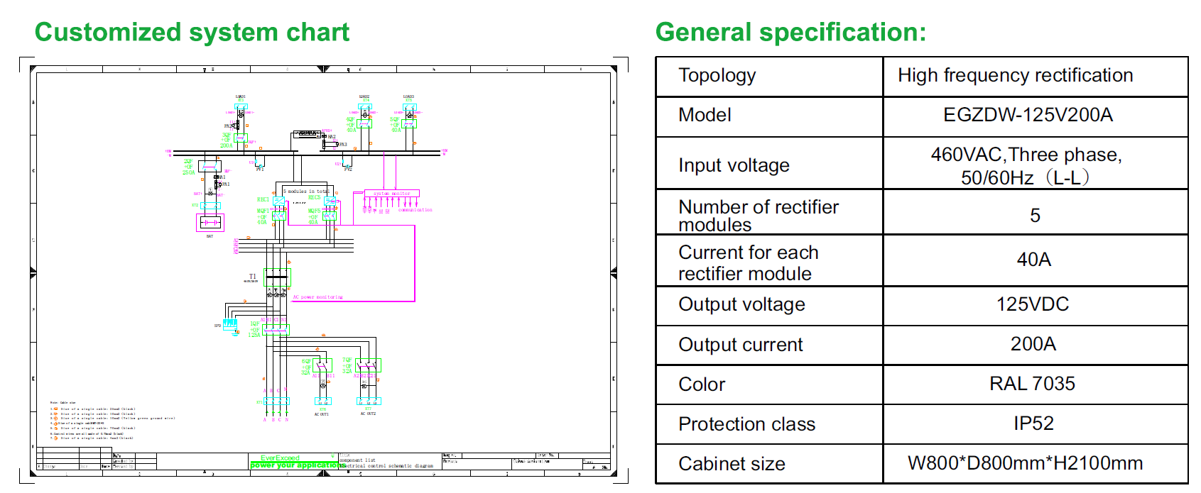 EverExceed menyesuaikan pengisi daya DC Modular 125VDC200A yang disearahkan frekuensi tinggi sesuai dengan kebutuhan pelanggan. Sistem operasinya terutama mengadopsi lima modul penyearah frekuensi tinggi, dan dilengkapi dengan modul pemantauan dan proteksi lonjakan petir; beban keluaran menggunakan rantai silikon buck yang disesuaikan (buck maksimum 35V, 50A). Selain itu, kabinet lP52 memiliki fungsi seperti kompensasi suhu, uji pelepasan baterai, dan gangguan arde. Pengisi daya DC yang disesuaikan ini memiliki fungsi pemantauan dan proteksi yang lebih baik, tidak hanya memenuhi kebutuhan daya peralatan khusus di gardu induk, tetapi juga memantau status kerja, memberi tahu petugas jaga secara tepat waktu jika ada peringatan gangguan, dan memastikan pengoperasian normal peralatan di gardu induk.