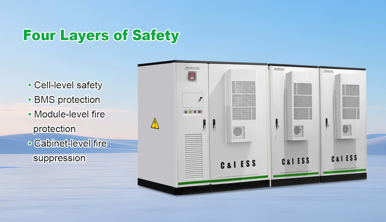 Dilengkapi empat lapisan keamanan — termasuk perlindungan tingkat sel, kontrol BMS canggih, proteksi kebakaran tingkat modul, dan penekanan kebakaran tingkat kabinet — sistem ini memastikan keselamatan operasional yang komprehensif dan andal.
