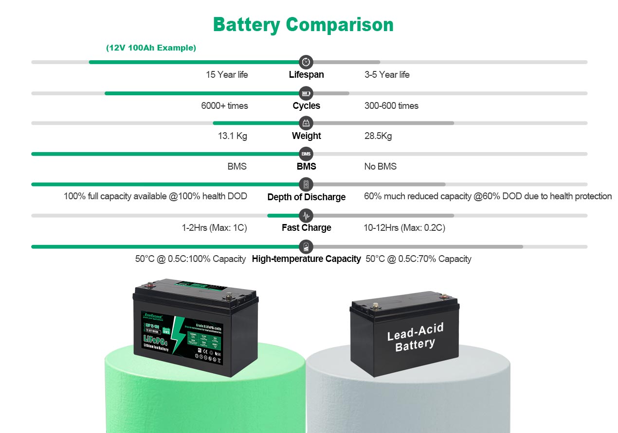 Baterai berkapasitas besar, cocok untuk digunakan di RV, berkemah, kapal pesiar, perahu nelayan, kereta golf, sistem energi surya, dll.